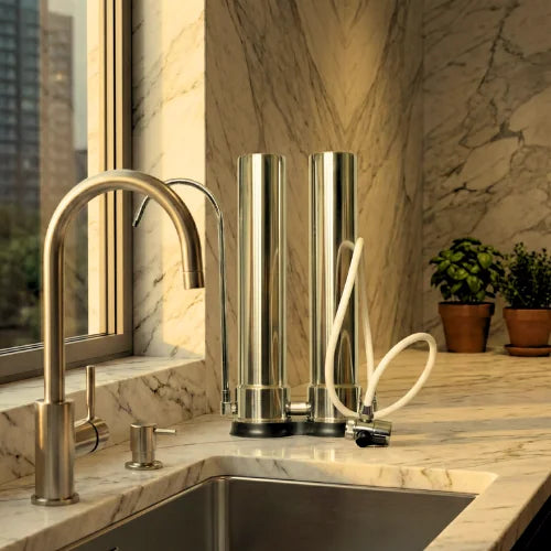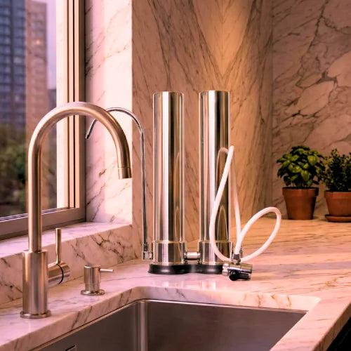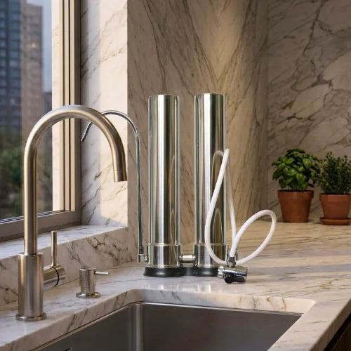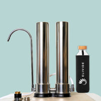 Crafted using high quality stainless steel, our system sits on the countertop next to your kitchen tap where it connects. Filters will be pre-installed and only need tightening upon opening.