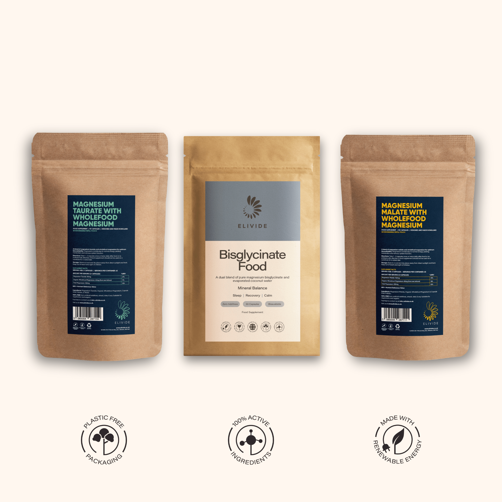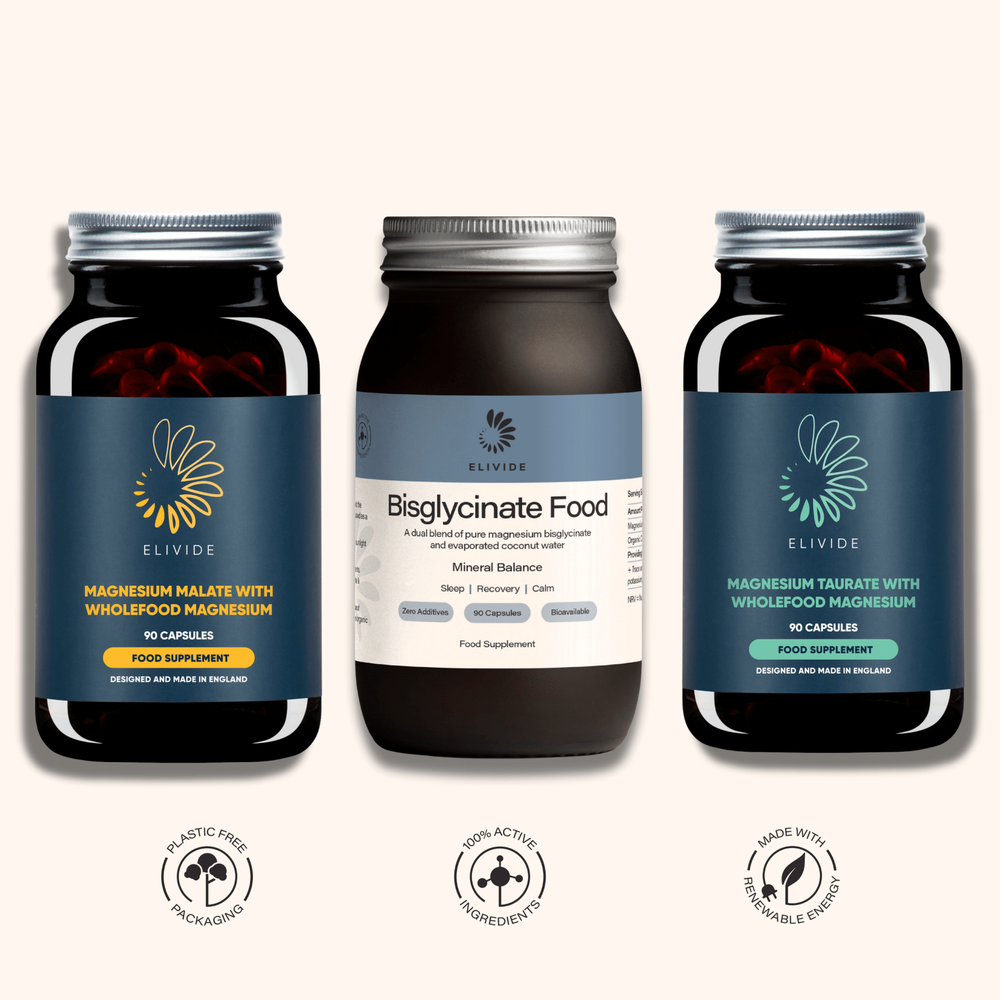 ELIVIDE Complete Magnesium Setup – full collection of glass jar magnesium supplements including Bisglycinate Food, Malate Food and Taurate Food for balance, energy and recovery